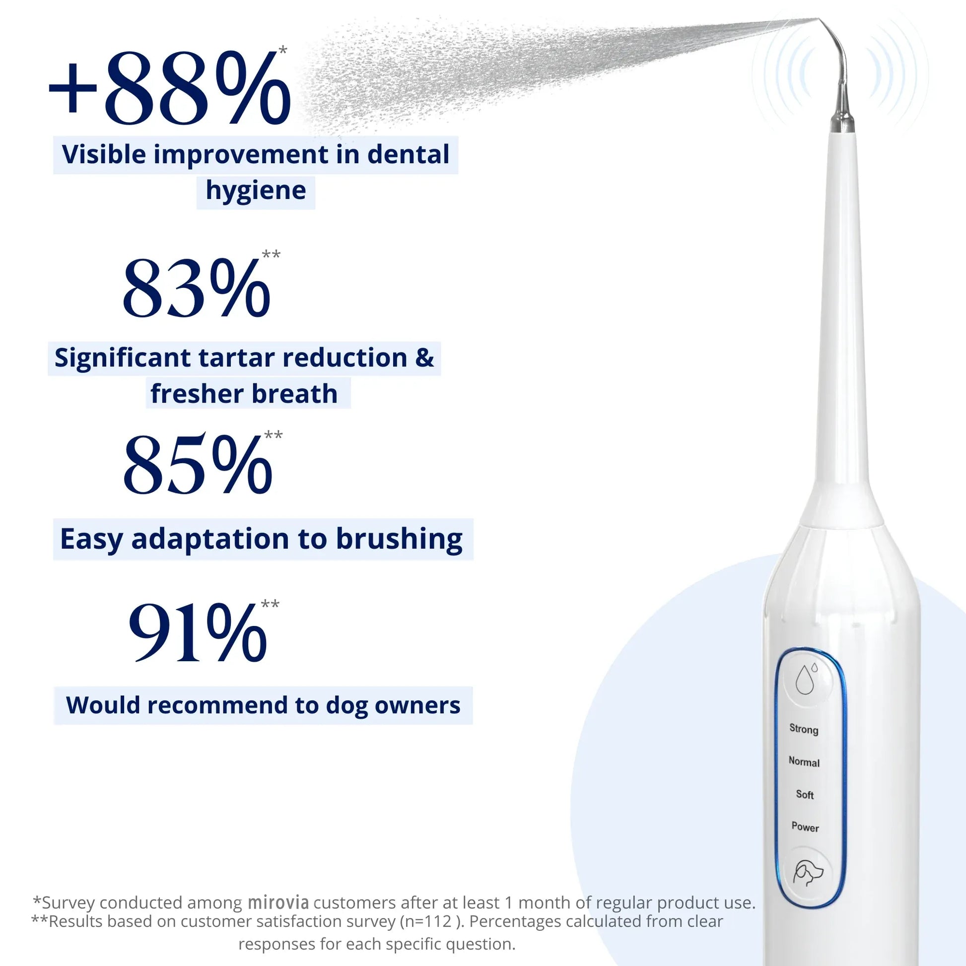 Effortless tartar removal for tiny pups tolargedog breeds: Mirovia™ is slim, ergonomic shape and 3 adjustable settings make dental care super easy. Even first-time users can keep their dog’s teeth clean and healthy without fighting or stress